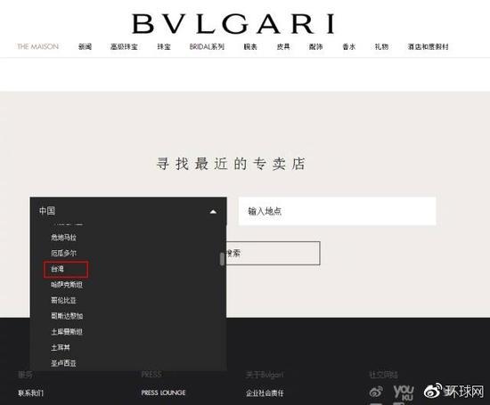 在“寻找最近的专卖店”时选择“国家”,标注了“中国澳门特别行政区”“中国香港特别行政区”,但“台湾”还是与“中国”并列。