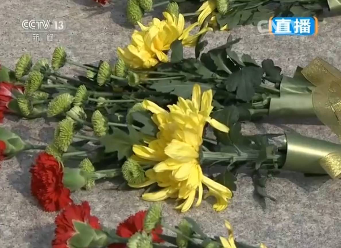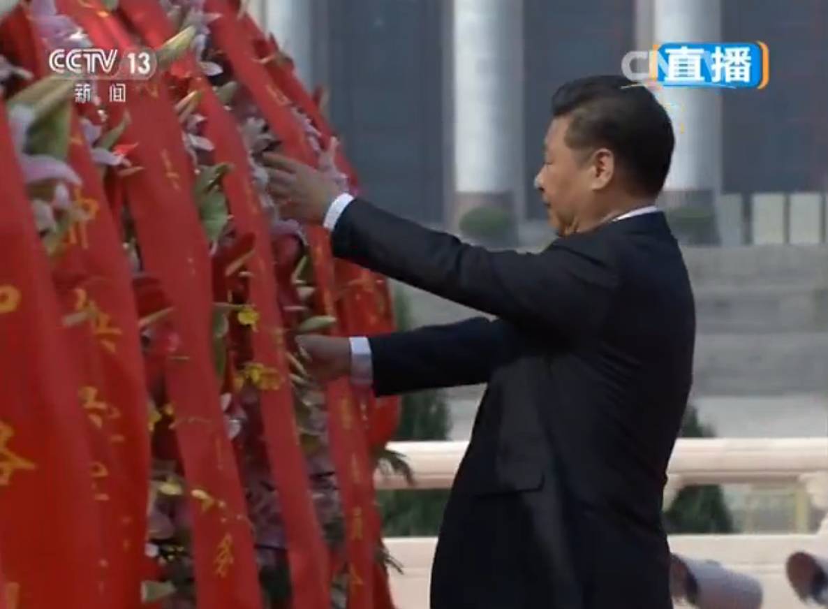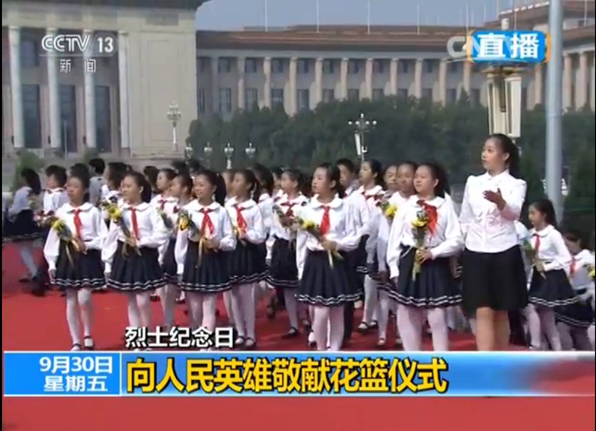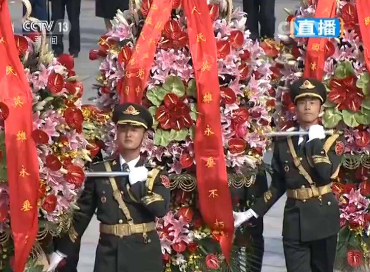 群众方阵前,以中共中央,全国人大常委会,国务院,全国政协,中央军委,各民主党派、全国工商联和无党派人士,各人民团体和各界群众,老战士、老同志和烈士亲属,中国少年先锋队名义敬献的9个大型花篮一字排开,花篮红色缎带上写着“人民英雄永垂不朽”8个金色大字。