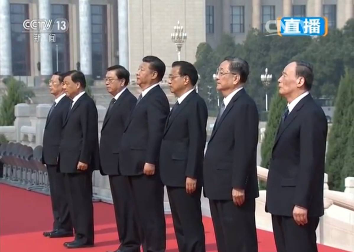 习近平等党和国家领导人登上纪念碑基座,在花篮前驻足凝视。习近平走上前,仔细整理花篮缎带。接着,习近平等党和国家领导人缓步绕行,瞻仰人民英雄纪念碑。