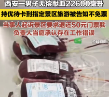 男子献血2.2万毫升景区不免票被告 景区优待献血者的政策岂能悬空