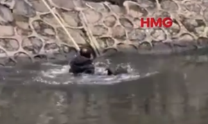老人摔倒在街头花坛中,城管队员爱心市民接力扶起老人